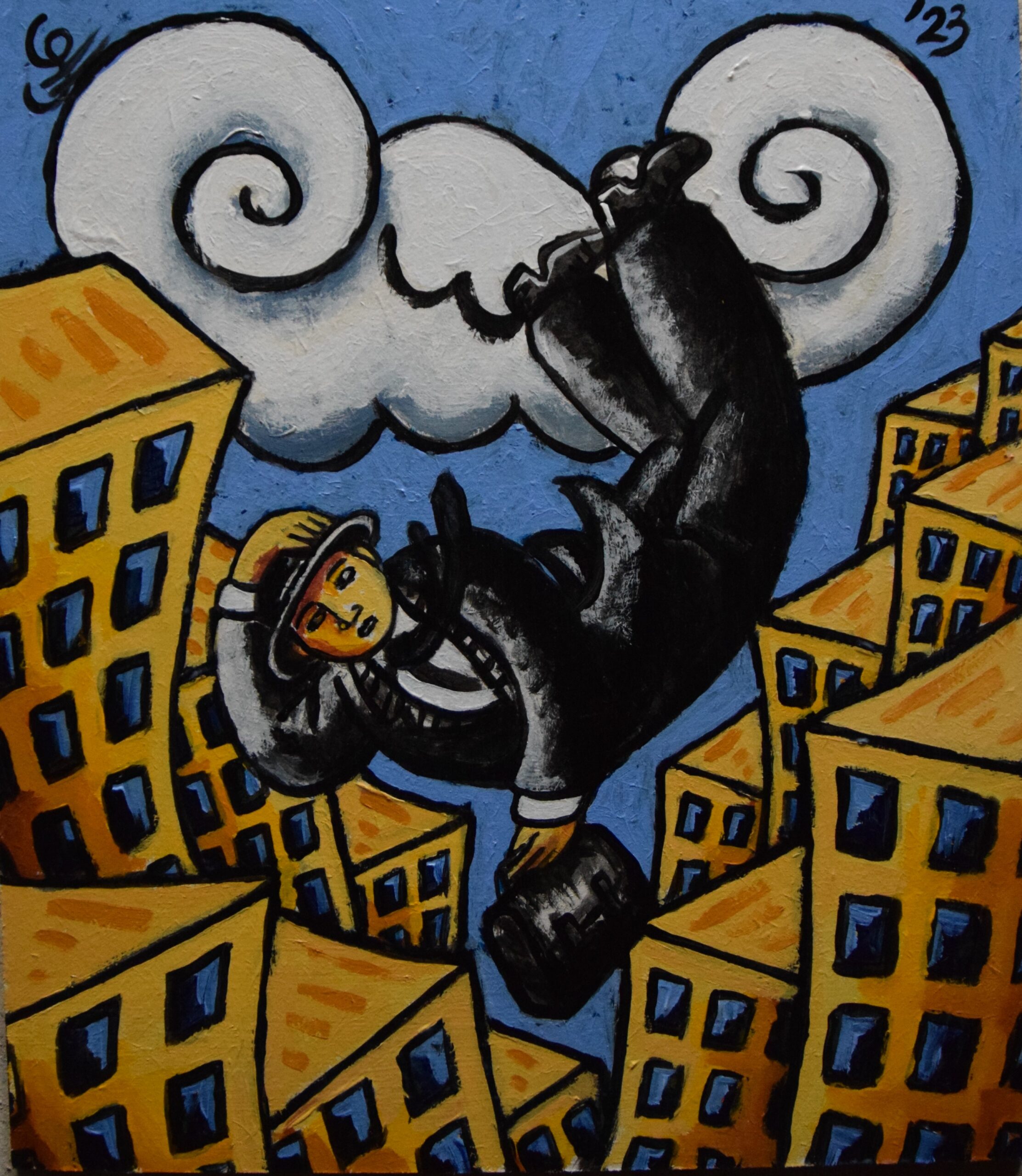 Het schilderij vangt het moment waarop realiteit en verbeelding elkaar raken: een herkenbaar tafereel over balans, tegenslag en hoop. Een klein, maar krachtig werk vol karakter en symboliek.
