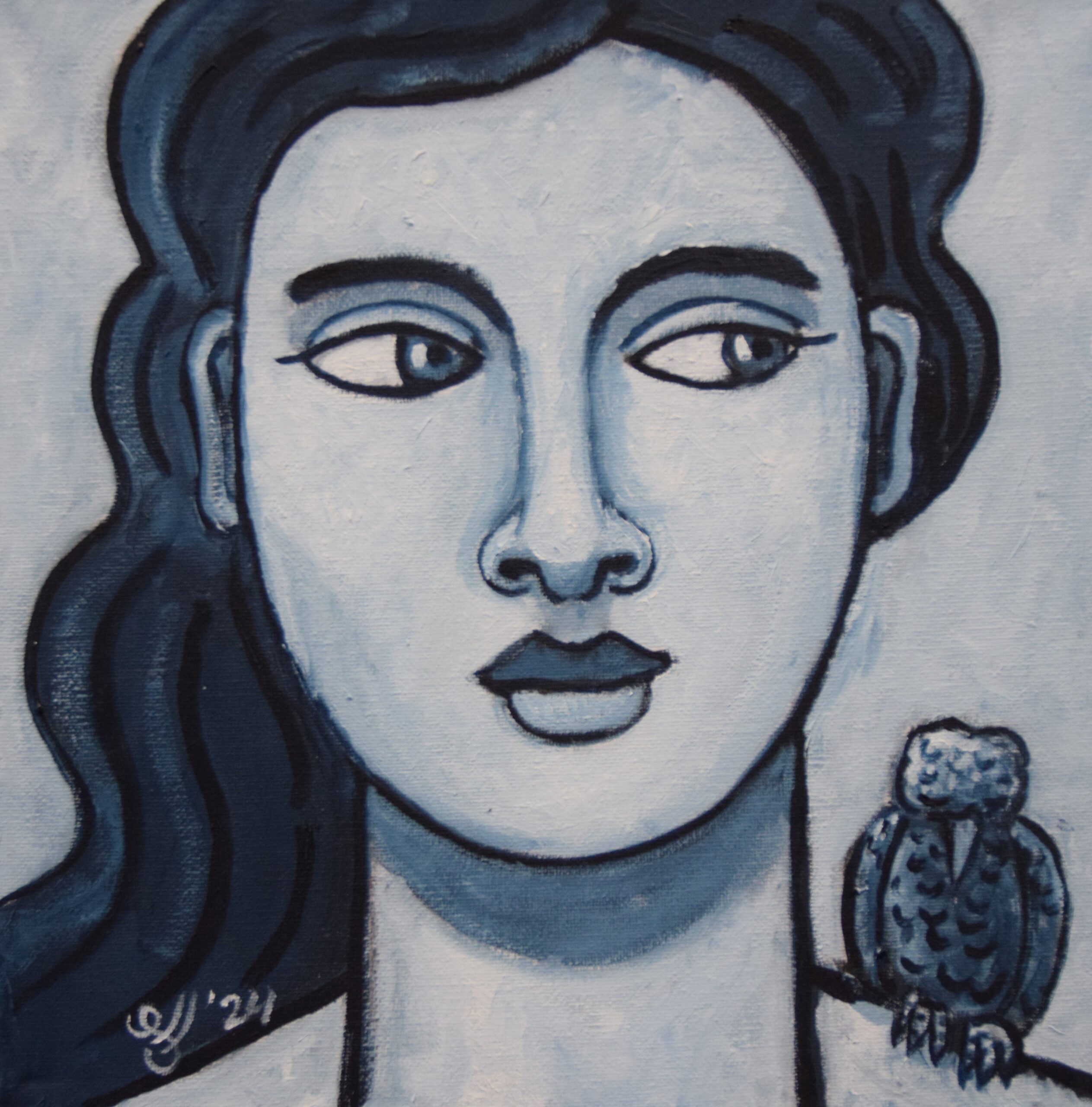 Blue Bird (29 x 29 cm, olie op linnen) van Jacques Tange. Een verstild en poëtisch portret in blauw, symbool voor rust, intuïtie en vrijheid. Prijs: €750,-. Huur: €22,50 per maand – volledig verrekenbaar bij aankoop.