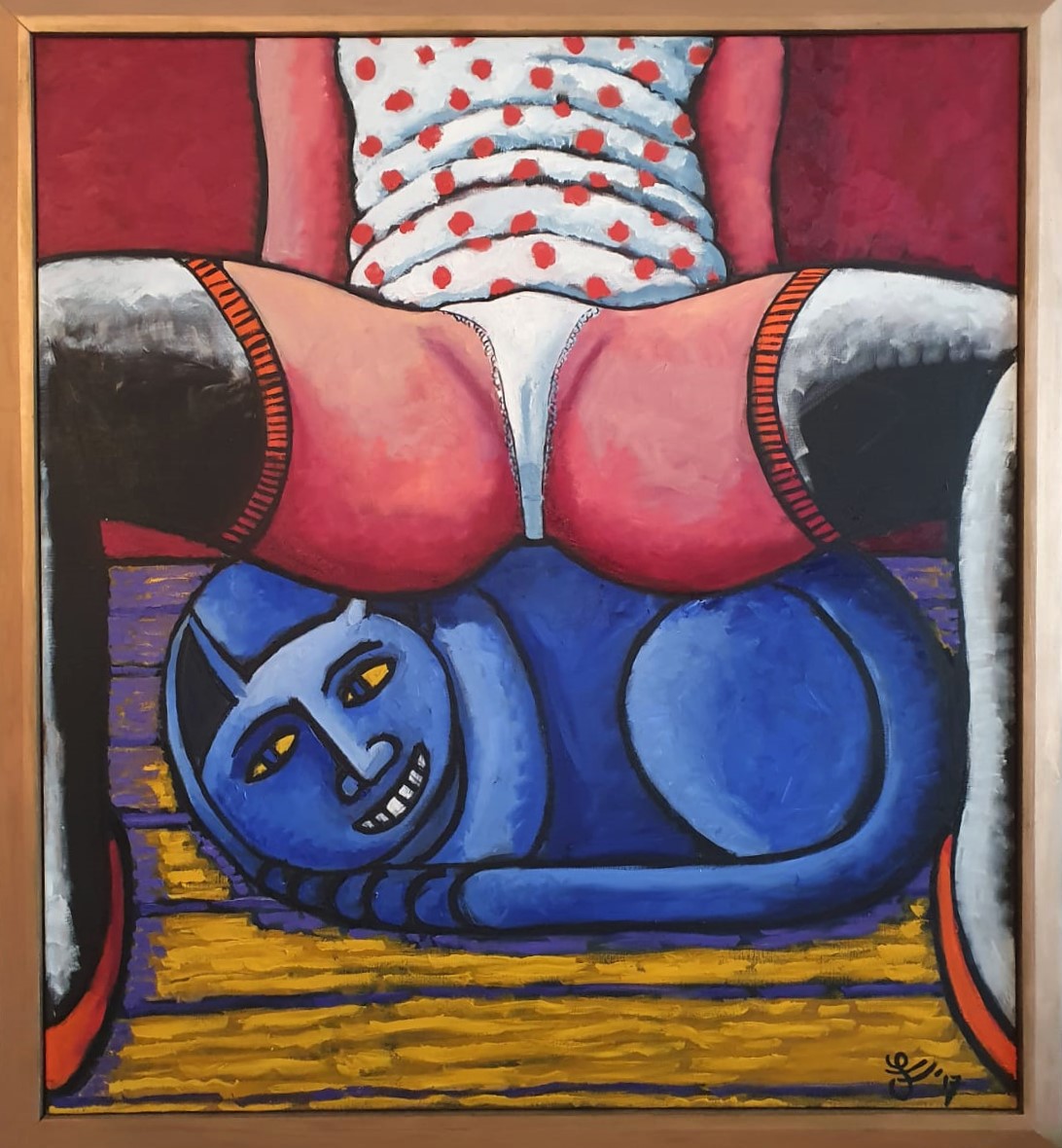 De krachtige compositie en contrasterende kleuren – felroze, diepblauw, warmgeel – creëren een dynamisch beeld dat tegelijk intiem en ironisch is. Dit schilderij nodigt de toeschouwer uit om te glimlachen, maar ook om verder te kijken dan het speelse oppervlak.