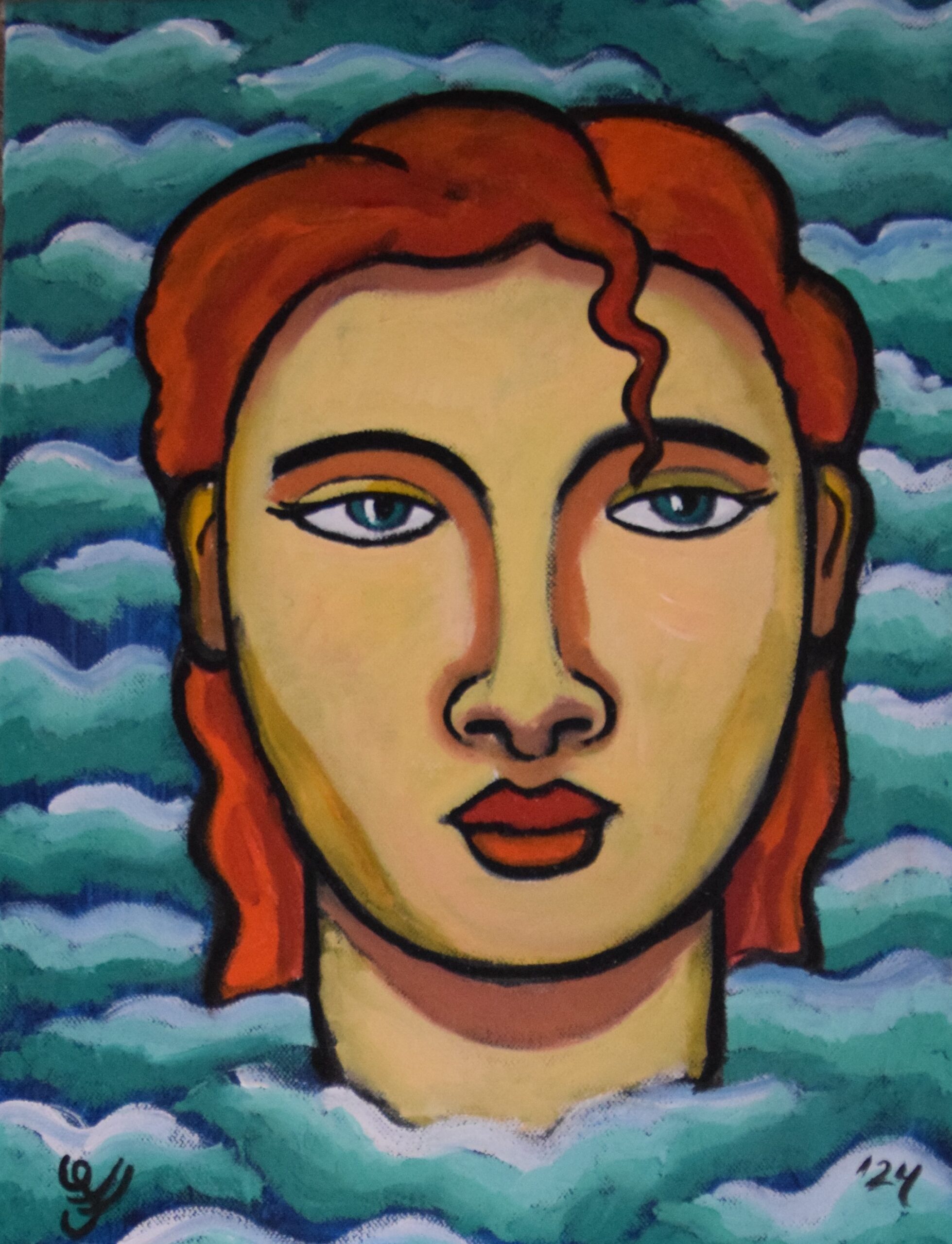 In this haunting and stripped-down composition, a solitary face emerges from a restless sea. The figure floats—neither sinking nor rising—held in a fragile balance between calm and collapse.