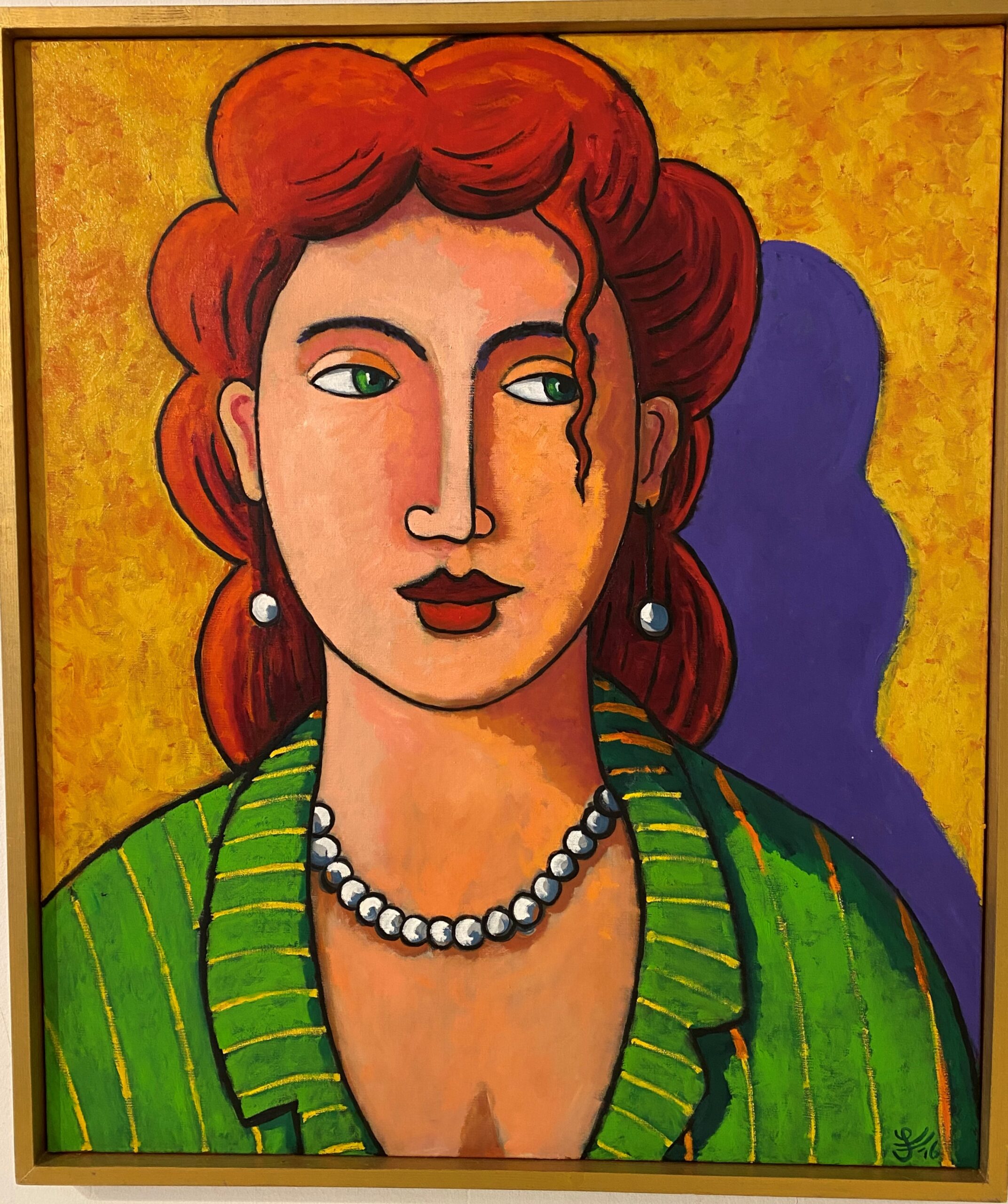 Set against a glowing golden background, her figure becomes timeless—both modern and classical. The bold contrast between the warm reds of her hair, the rich green of her garment, and the soft luminosity of her skin gives the painting a refined yet vibrant energy.