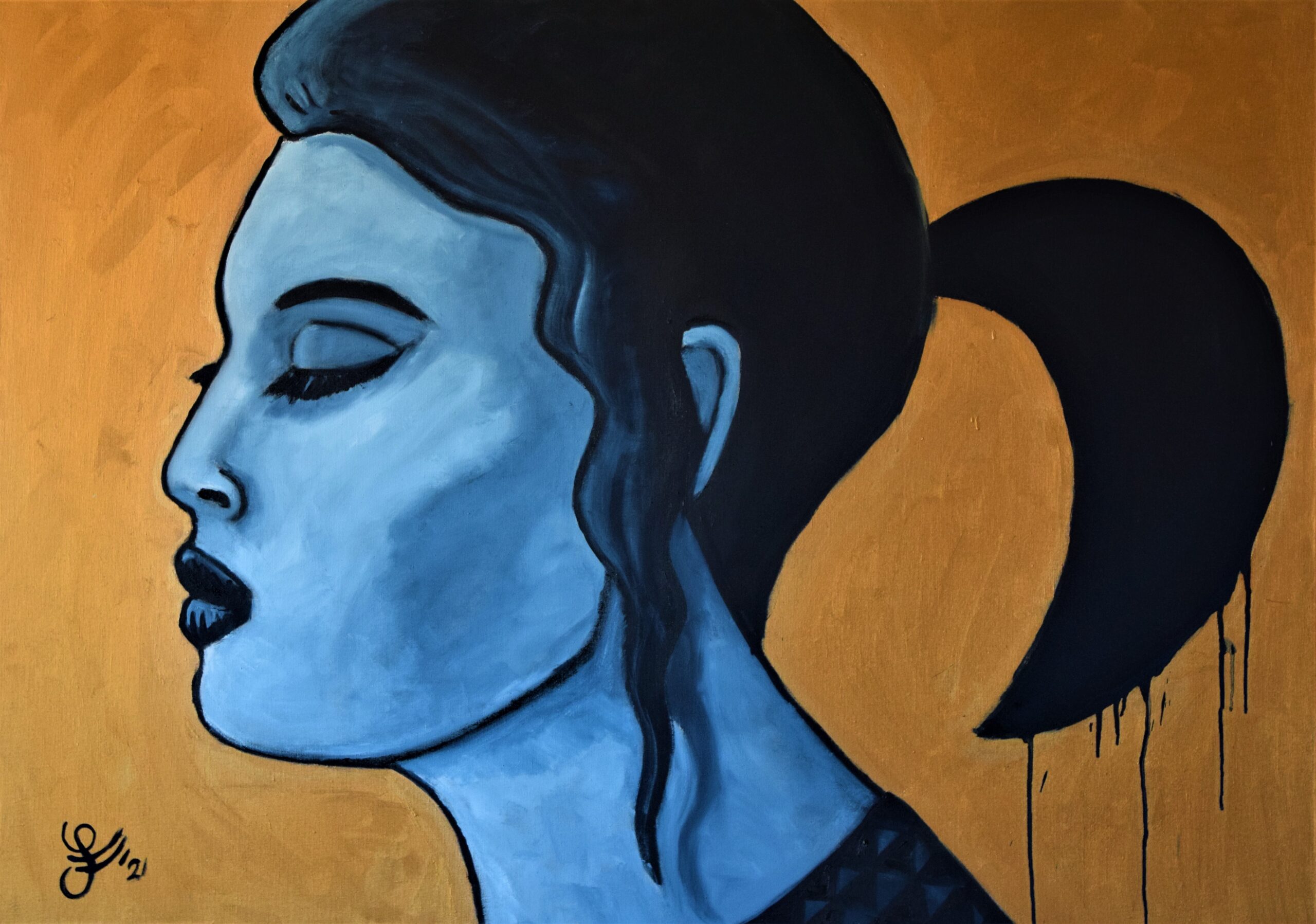 In this striking and minimal composition, a female profile emerges in cool, monochromatic blue tones. Her eyes are closed, her expression calm—yet there is a quiet tension beneath the surface, as if something remains unspoken.