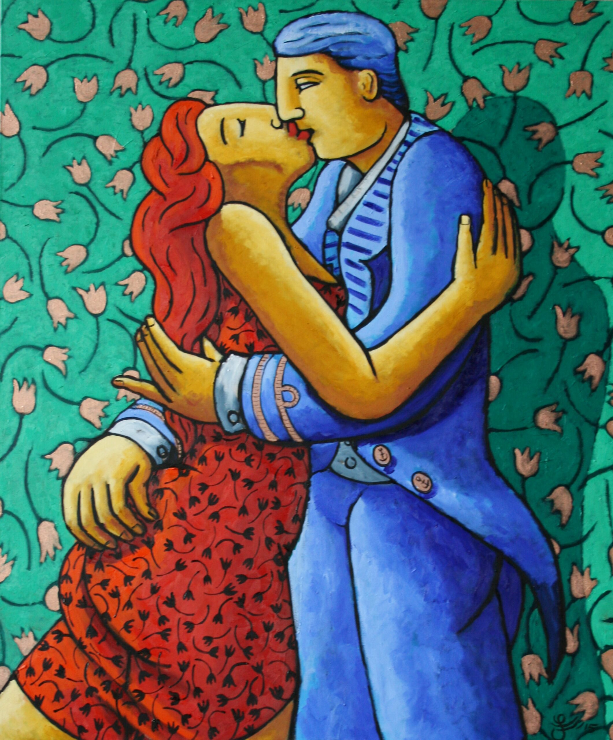 In this vibrant and emotionally charged composition, two figures are captured in a moment of complete surrender—a kiss that feels both tender and intense. Their bodies intertwine effortlessly, creating a single flowing movement of warmth and closeness.