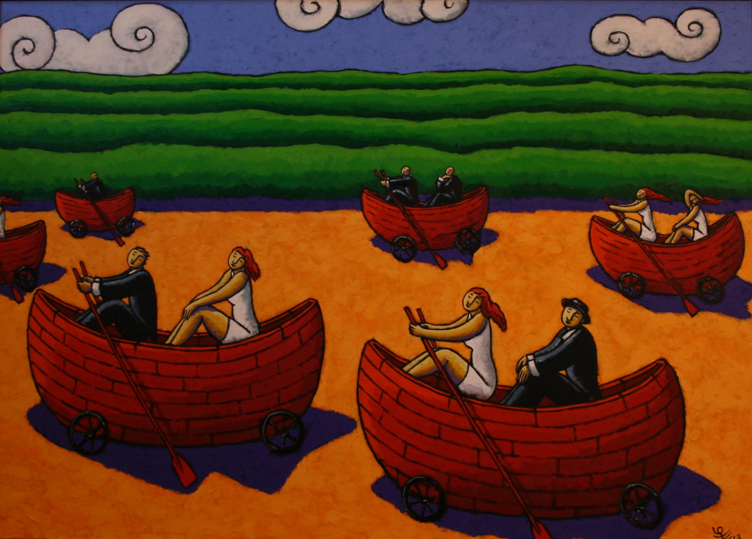 In deze levendige en surrealistische compositie drijven figuren in felrode boten over een warm, gloeiend landschap – maar niets is wat het lijkt. De boten rollen over het land in plaats van over het water, voortgedreven door roeispanen die beweging zonder richting suggereren.