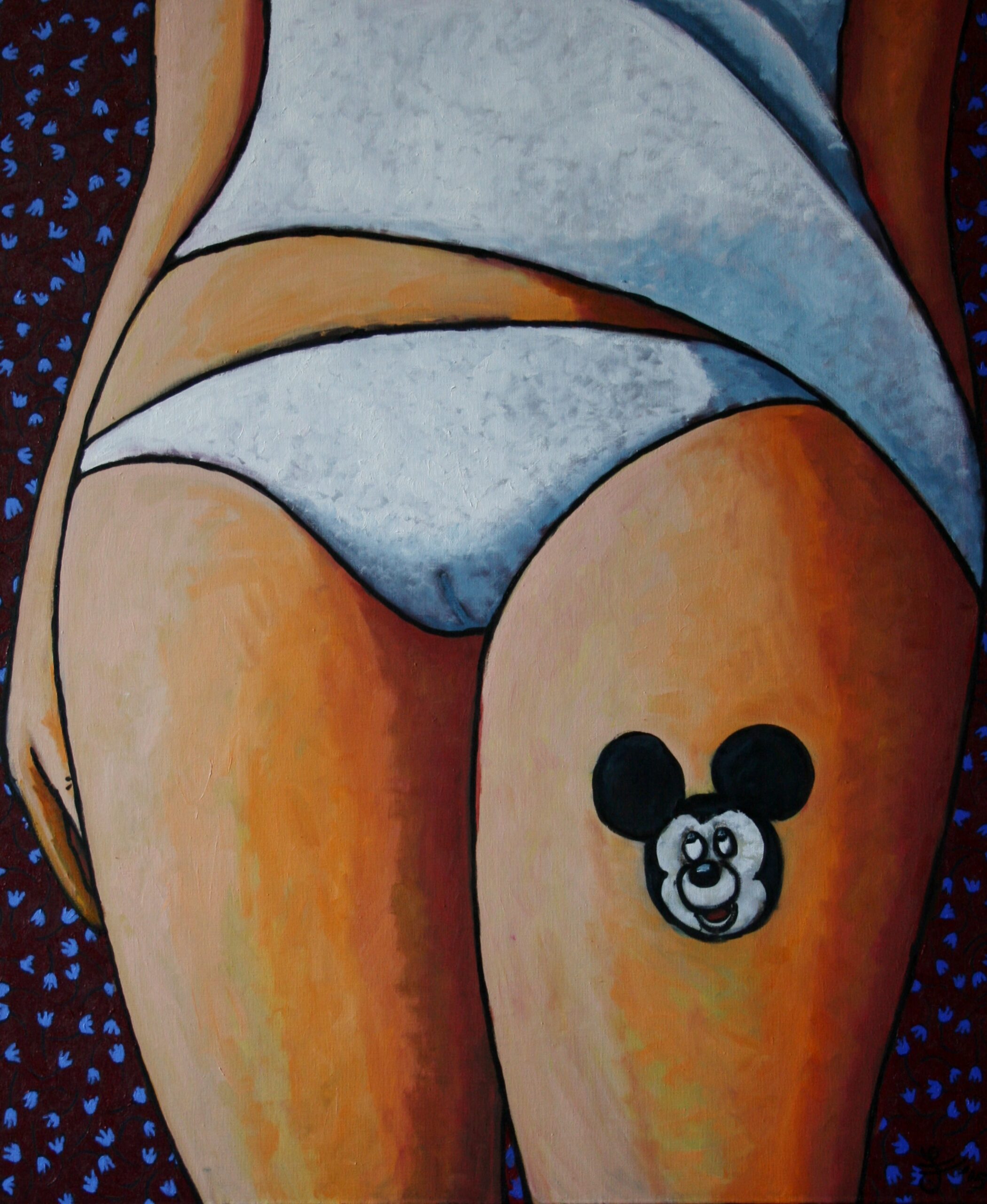 In dit opvallende acrylschilderij vormt een uitgesneden, intieme weergave van het vrouwelijk lichaam het toneel voor iets speels maar tegelijkertijd provocerends. De compositie is direct en compromisloos: zachte rondingen, warme tinten en een minimalistisch wit kledingstuk contrasteren met een rijk gedessineerde achtergrond.